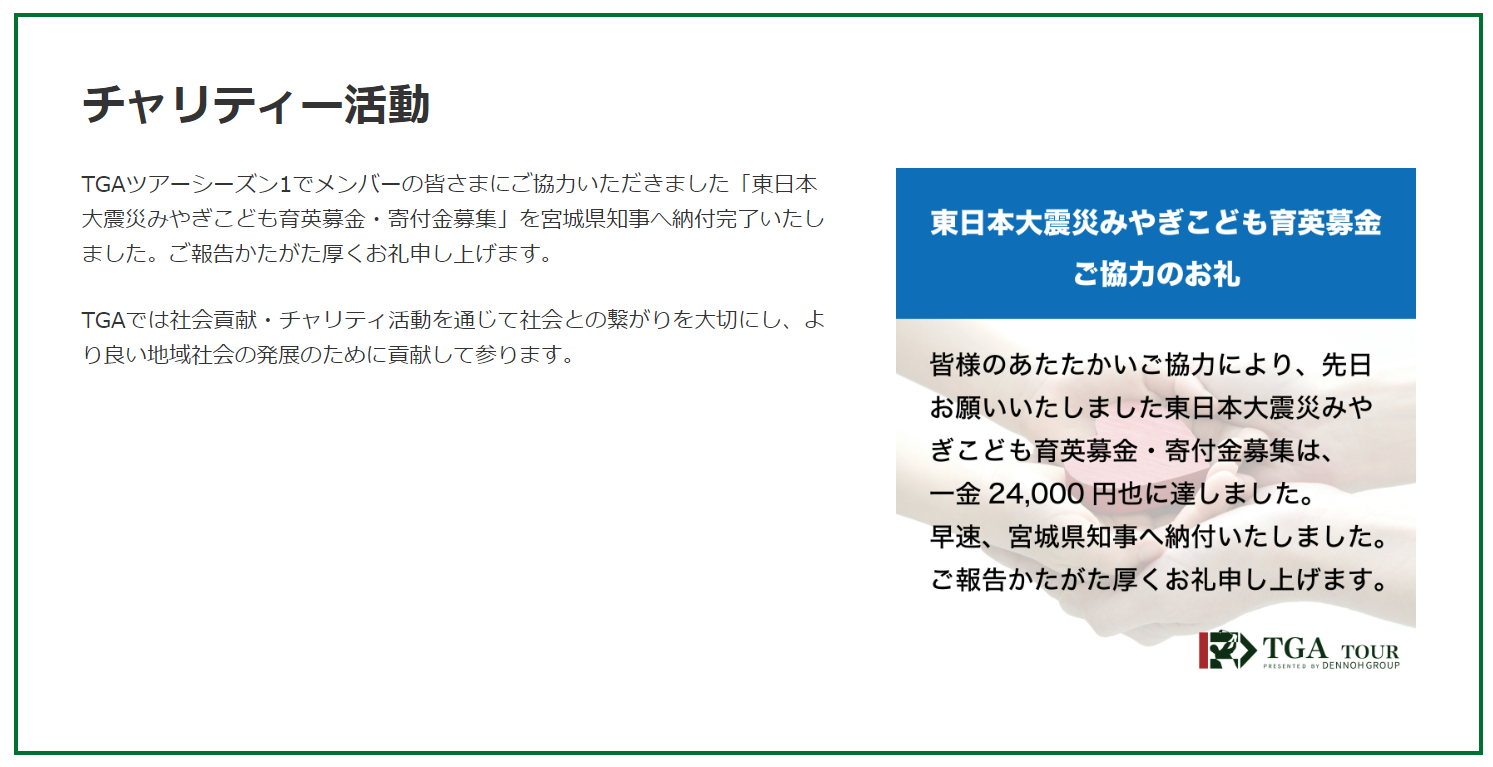 TGAファーストシーズンでは、会員の皆様よりたくさんのチャリティのご協力をいただきました。